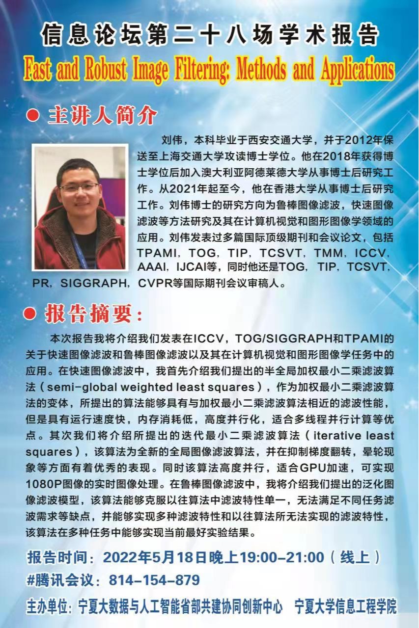 报告时间:2022年5月18日(星期三)晚上19:00-21:00(线上)#腾讯会议:814-154-879主办单位:宁夏大数据与人工智能省部共建协同创新中心 William希尔体育题目:Fast and Robust Image Filtering: Methods and Applications个人简历:刘伟本科毕业于西安交通大学,并于2012年保送至上海交通大学攻读博士学位。他在2018年获得博士学位后加入澳大利亚阿德莱德大学从事博士后研究工作。从2021年起至今,他在香港大学从事博...