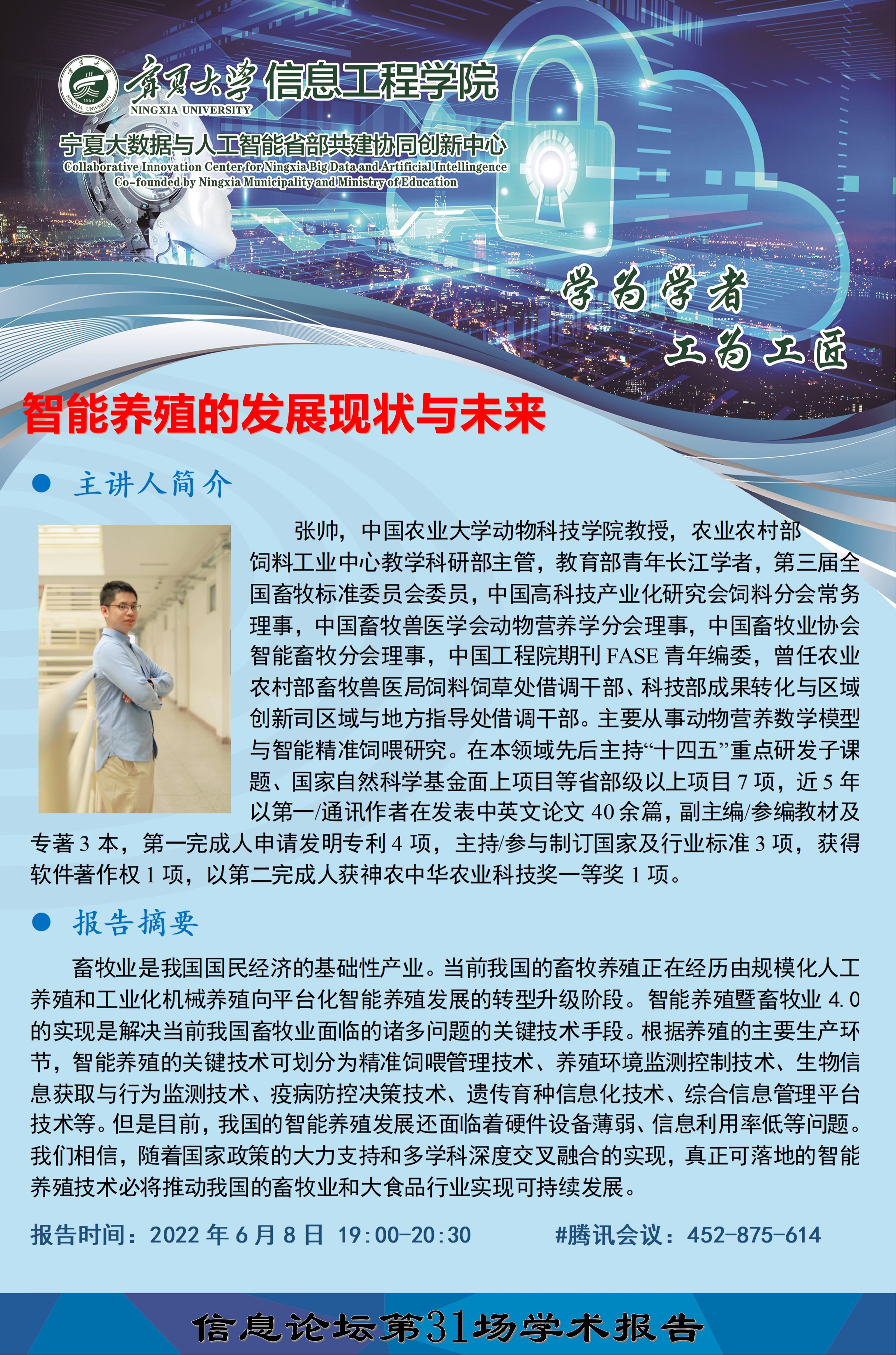 报告时间:2022年6月8日(星期三)晚上19:00-20:30(线上)#腾讯会议:452-875-614报告题目:智能养殖的发展现状与未来报告人简介:张帅,中国农业大学动物科技学院教授,农业农村部饲料工业中心教学科研部主管,第三届全国畜牧标准委员会委员,中国高科技产业化研究会饲料分会常务理事,中国畜牧兽医学会动物营养学分会理事,中国畜牧业协会智能畜牧分会理事,中国工程院期刊FASE青年编委,曾任农业农村部畜牧兽医局饲料饲草处借调干部、科技部成果转化与区域创新司区域与地方指导处借调干部。主要从事动物营养数学模型与智能精准饲喂研究。在本领域先后主持“十四五”重点研发子课题、国家自然科学基金面上项目等省部级以上项目7项,近5年以第一/通讯作者发表中英文论文40余篇,副主编/参编教材及专著3本,第一完成人申请发明专利4项,主持/参与制订国家及行业标准3项,获得软件著作权1项,以第二完成人获神农中华农业科技奖一等奖1项。报告摘要:畜牧业是我国国民经济的基础性产业。当前我国的畜牧养殖正在经历由规模化人工养殖和工业化机械养殖向平台化智能养殖发展的转型升级阶段。智能养殖暨畜牧业4.0的实现是解决当前我国畜牧业面临的诸多问题的关键技术手段。根据养殖的主要生产环节,智能养殖的关键技术可划分为精准饲喂管理技术、养殖环境监测控制技术、生物信息获取与行为监测技术、疫病防控决策技术、遗传育种信息化技术、综合信息管理平台技术等。但是目前,我国的智能养...