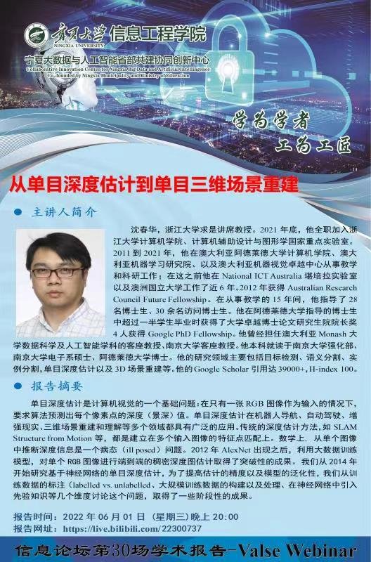 论坛时间:2022年06月01日(星期三)晚上20:00 (北京时间)主 题:从单目深度估计到单目三维场景重建主 持 人:刘昊(WilliamHILL中国)直播网址:https://live.bilibili.com/22300737报告嘉宾:沈春华(浙江大学)报告时间:2022年06月01日(星期三)晚上20:00 (北京时间)报告题目:从单目深度估计到单目三维场景重建沈春华,浙江大学求是讲席教授。2021年底他全职加入浙江大学计算机学院、计算机辅助设计与图形学国家重点实验室。2011到2021...