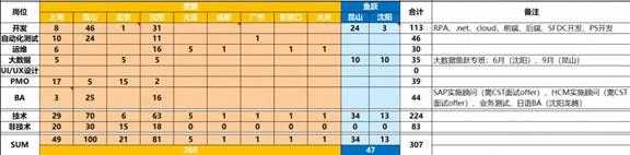 虎耀项目,非技术岗位(83人),二本以上,专业不限,入职后从事PMA和BA工作。其中SAP岗位倾向专业:财会、商管优先,金融视情况而定,HCM要的是人力资源专业背景的。(需求量:HCM上海和昆山15个,SAP昆山和沈阳30个)英语要求4级,能简单沟通。