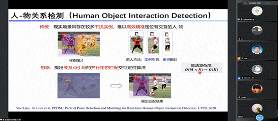 刘偲教授报告的题目是“跨模态分析与生成”,他从四个方面讲述了最新工作成果:一是人-物关系检测分割,人-物关系分割是一项新的任务,旨在预测人体与周围实体之间的关系,人和实体均以像素级掩码的形式进行表达;二是图像视频分割以及语言指导的图像视频分割,给定自然语言表达式和图像/视频,生成语言表达对应的实体的像素级掩码;三是主动感知,需要根据语言指令导航到远程对象并对其进行定位;四是人工智能+艺术,包括视频自动配乐,语言指导的图像美化以及细节保持的妆容迁移。
