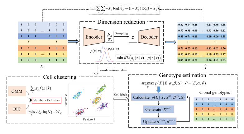 为解决这一难题,余振华课题组提出了一种基于无监督表征学习的计算方法,在隐含低维空间中对细胞进行表征和聚类,并结合传统的MCMC、EM等方法对细胞基因型进行准确估计,增强了预测结果的可解释性。这一成果对于揭示肿瘤发生和发展的生物学机理具有重要推动作用。该成果以“bmVAE: a variational autoencoder method for clustering single-cell mutation data”为题被生物信息学顶级期刊《Bioinformatics》录用,论文第一作者为我院计算机技术在读硕士研究生延佳倩,通讯作者为我院余振华副教授。