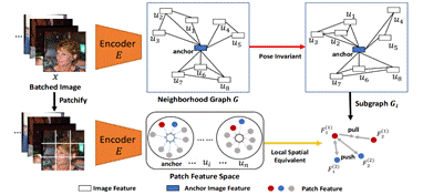 为此,研究团队提出了一种自监督学习方法,其能够通过结构等方差来模拟头部姿态的非线性变化。该方法设计了一个代理任务,以不亦重不需要外部标签的自我监督形式提取三种不同的方向特征。在技术上,模型首先将从学习到的特征表示空间中领域样本建立一个完整的领域图,这是由人脸的外观和形状信息决定的。此外,为了细化不同邻域之间的关系,模型希望每个子图都被同一外部属性的人脸所主导,如表情、性别和遮挡。为了模拟不同潜在语义因子控制下的姿态不变性,模型鼓励属于同一子图的特征相似,并使所有其他子空间之间的语义相似度最大化。通过这种方式,就可以构建面部潜在的局部关联,如眼睛和鼻子的空间对应关系,而不仅仅是同质的视觉特征。流程图如下:
