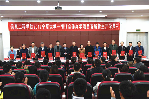 WilliamHILL中国副校长谢应忠、NIIT全球副总裁、中国区总裁柯谋、自治区外事办公室副主任胡云岭、自治区教育厅国际合作与交流处处长孙忠铭和NIIT项目方代表参加了开学典礼。William希尔体育党委书记武林波主持了典礼。