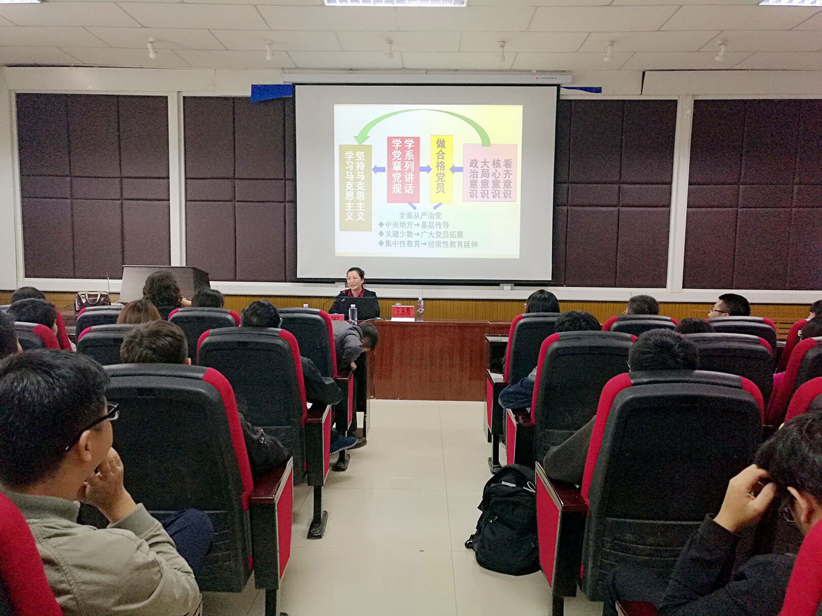 杨军老师对王教授的报告做了总结。精彩的报告会在热烈掌声中落下帷幕。王教授的报告,令全体师生党员清楚认识了新时代下党员应该以什么样的标准要求自己,同时让所有党员了解了学习党章和做合格党员之间不可割舍的理论关系。报告内容主题鲜明,内容丰富,有理有据,令所有到场党员更加领悟到作为一名党员学习“两学一做”深刻内涵的重要性。
