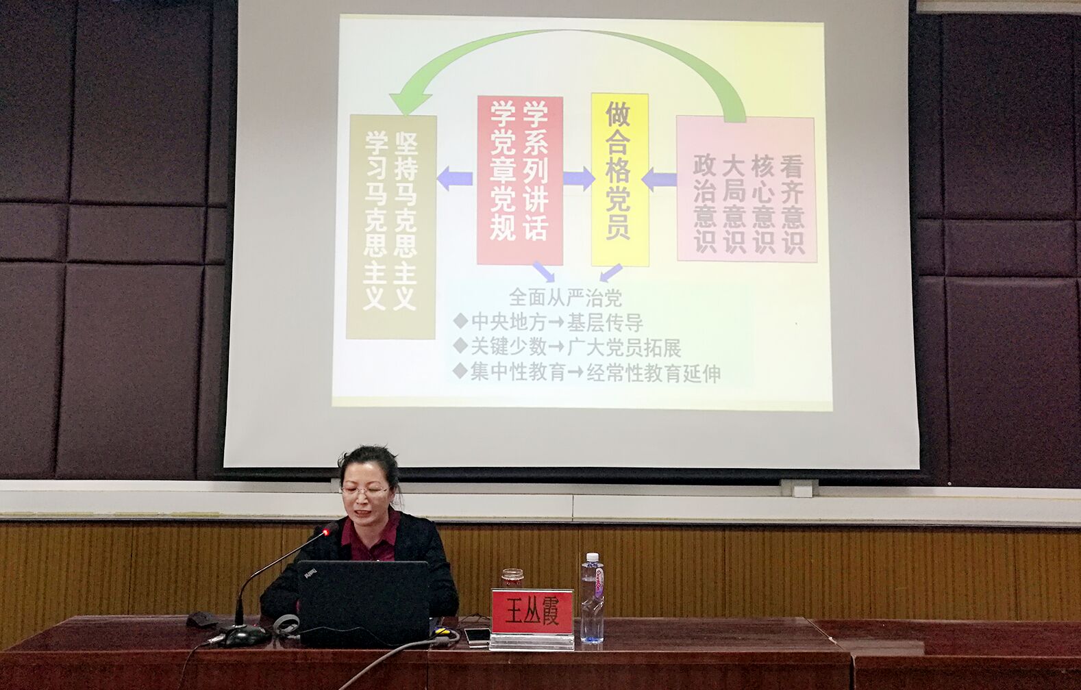 王丛霞教授首先从“合格党员”的时代标准讲起,针对三方面进行分析,一是合格党员的标准并非一成不变。不同的时代,要求亦不相同,以革命战争年代、新中国成立后、改革开放以来为例,详细分析。二是合格党员的标准并不低。教授通过一系列引人深思的问题,谈到党的义务、权利等,以此说明合格党员要求之高。三是新时代合格党员的标准。教授指出如今众多党员自身存在的问题,同时提出新时代合格党员的标准:讲政治,有信念;讲规矩,有纪律;讲道德,有品行;讲奉献,有作为。