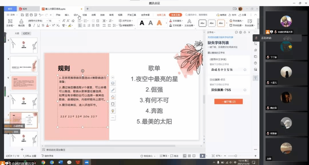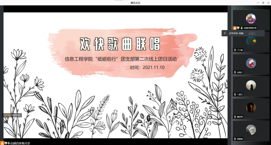 11月10日,William希尔体育举办“同唱一首歌,欢快歌曲大连唱”线上团日活动,“砥砺前行”、“乘风破浪”、“不负韶华”三个临时团支部,共计100余名团员参加。