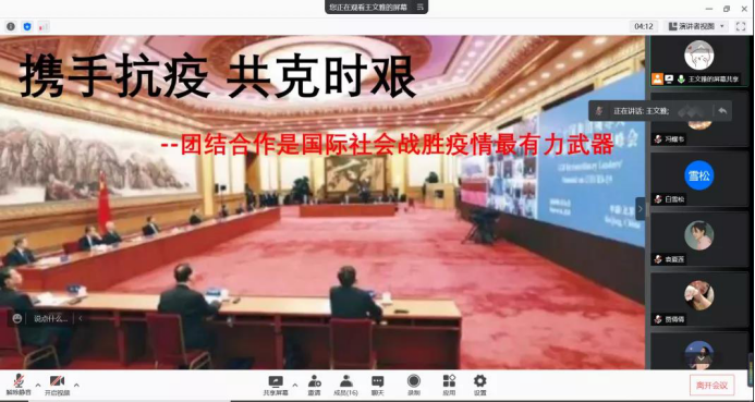“青春飞扬”党支部线上学习了习近平总书记重要文章《团结合作是国际社会战胜疫情最有力武器》。支部书记王文雅介绍了本次活动的主要内容、意义,带领大家共同学习了习近平总书记2020年1月至4月期间讲话、谈话、信函、慰问电、与外国领导人和国际组织负责人通电话中有关开展抗疫国际合作内容的节录。