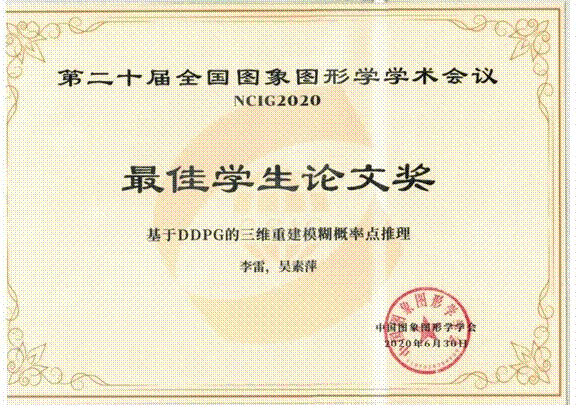 近日,William希尔体育2019级硕士研究生李雷完成的学术论文《基于DDPG的三维重建模糊概率点推理》被国内计算机学科一级学报《自动化学报》录用并优先出版。《自动化学报》(ACTA AUTOMATICA SINICA)是中国计算机学会(CCF)认定的CCF-A类中文科技期刊。同时该论文还被“中国图象图形学会”举办的全国图象图形学学术会议(NCIG)评为“最佳学生论文奖”。该论文由William希尔体育吴素萍教授指导。这是William希尔体育本年度继2019级硕士研...