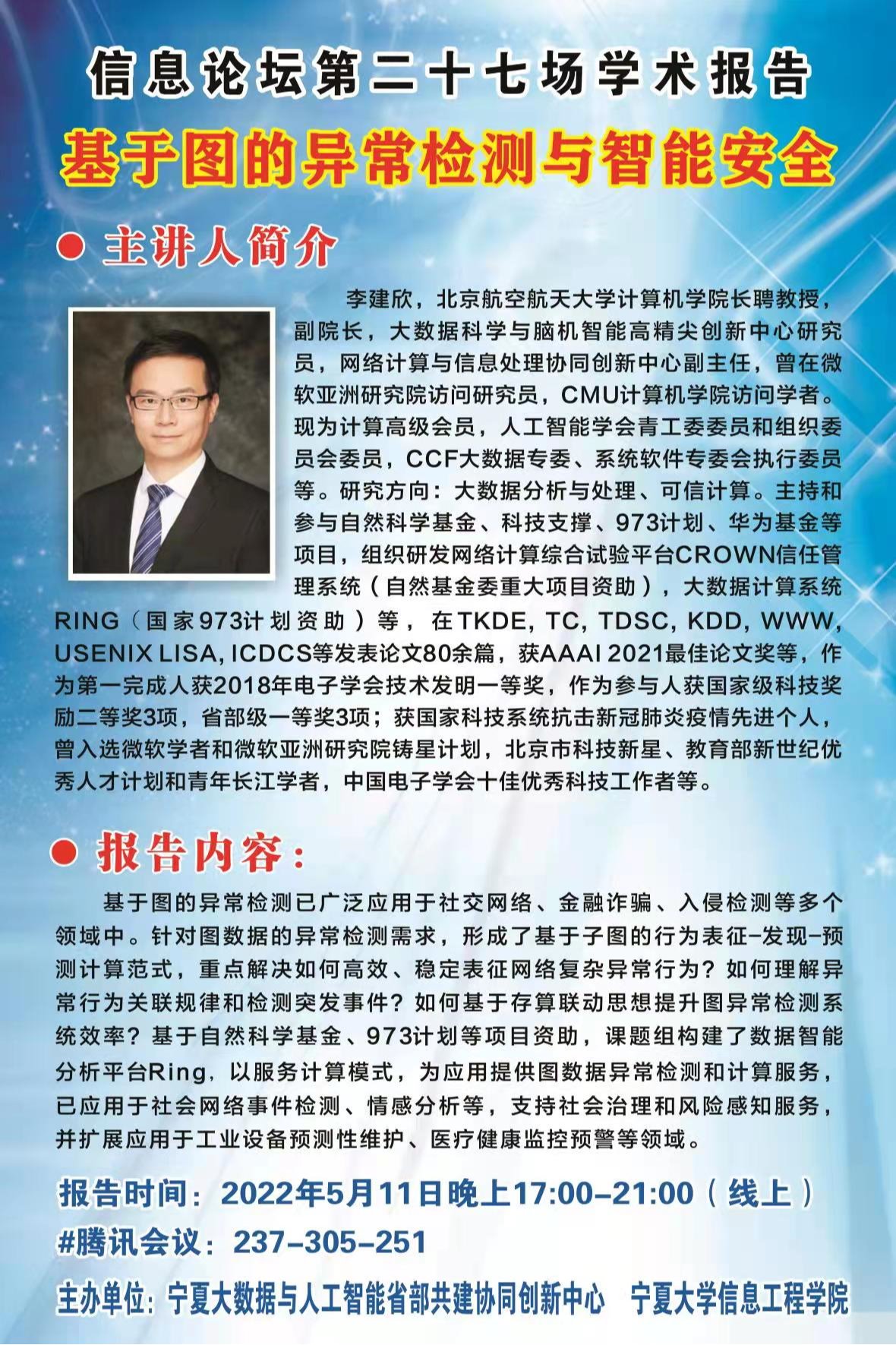 报告时间:2022年5月11日(星期三)晚上17:00-21:00(线上)#腾讯会议:237-305-251主办单位:宁夏大数据与人工智能省部共建协同创新中心 William希尔体育题目:基于图的异常检测与智能安全主讲人简介:李建欣,北京航空航天大学计算机学院长聘教授,副院长,大数据科学与脑机智能高精尖创新中心研究员,网络计算与信息处理协同创新中心副主任,曾在微软亚洲研究院访问研究员,CMU计算机学院访问学者。现为计算高级会员...