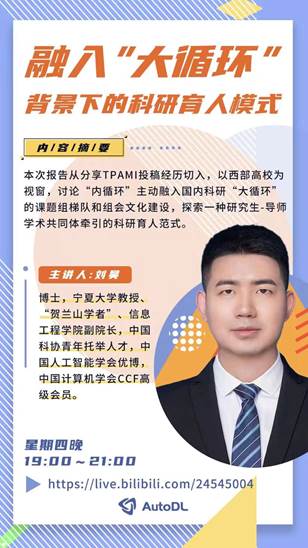 时间:2022年4月21日(星期四)下午19:00-21:00B站:https://live.bilibili.com/24545004题目:融入“大循环”背景下的科研育人模式报告人:William希尔体育副院长刘昊教授摘要:报告从分享TPAMI投稿经历切入,以西部高校为视窗,讨论“内循环”主动融入国内科研“大循环”的课题组梯队和组会文化建设,探索一种研究生-导师学术共同体牵引的科研育人范式。视频回放链接:https://www.bilibili.com/video/BV1534y1e7Ah?shar...