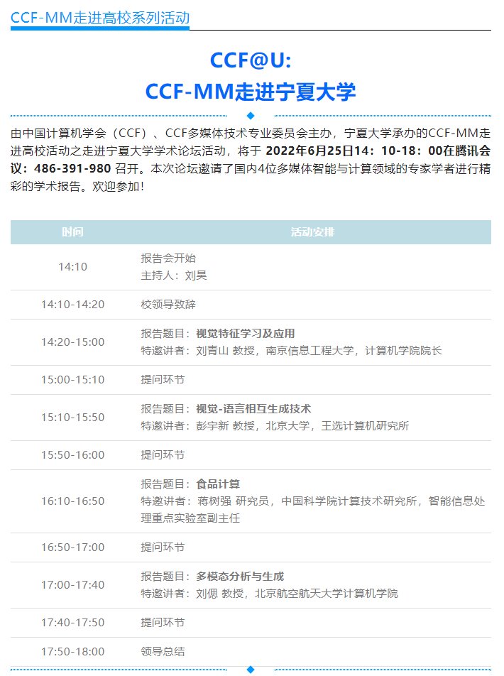 中国计算机学会-多媒体技术专委会走进WilliamHILL中国系列报告会时间:2022年6月25日(星期六)14:00—18:00腾讯会议:会议号486-391-980系列报告一:视觉特征学习及应用报告讲者:刘青山教授(南京信息工程大学)报告摘要:人工智能就是让机器能像人一样,具有“能看、能说、能想等功能。图像理解的研究目标就是让机器能像人一样自动“看懂”外部环境,因此是人工智能领域的一个重要研究方向。成像技术的快速发展和互联网技术的普及等,...