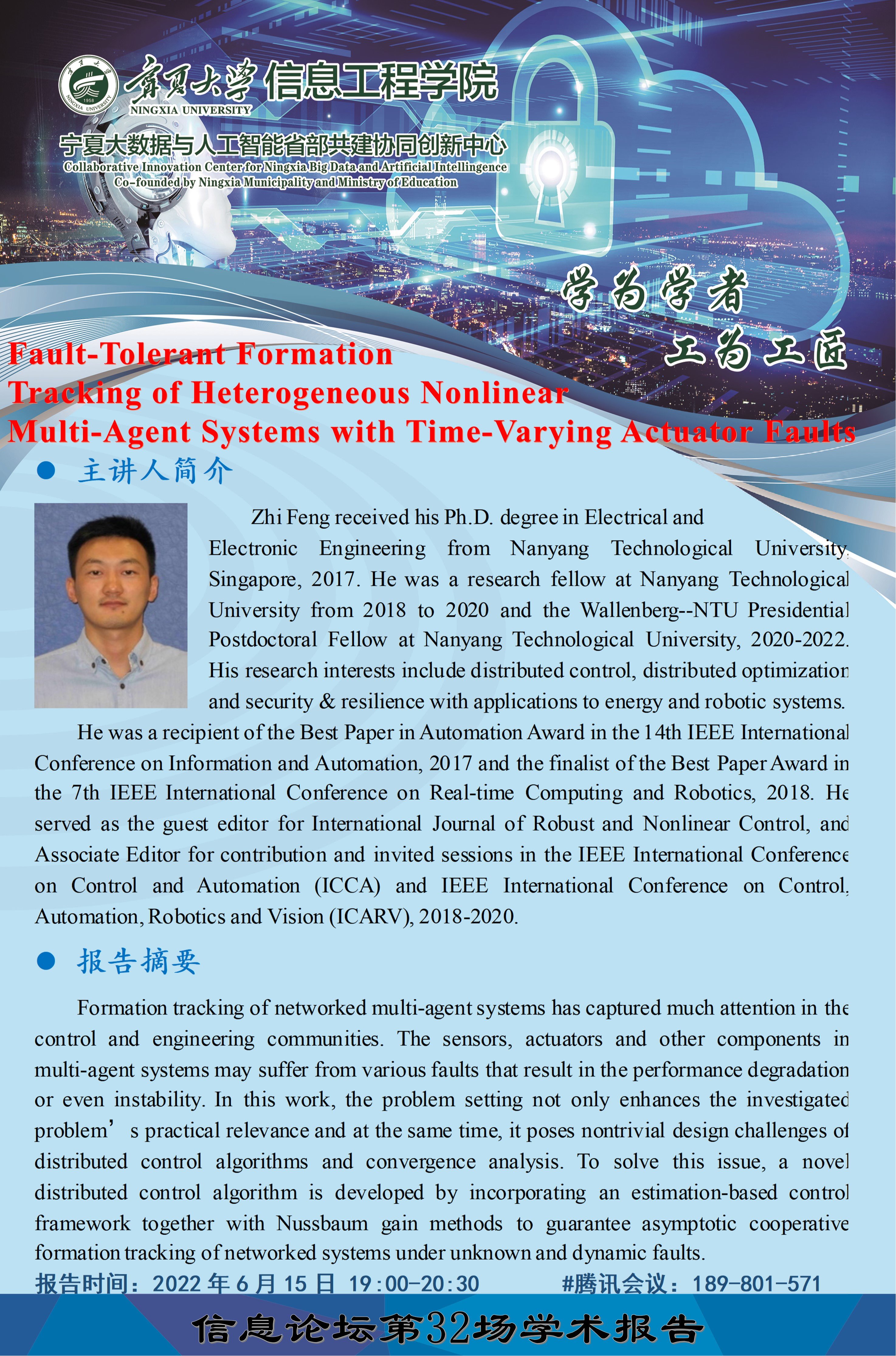 报告时间:2022年6月15日(星期三)晚上19:00-20:30(线上)#腾讯会议:189-801-571报告题目:Fault-Tolerant Formation Tracking of Heterogeneous Nonlinear Multi-Agent Systems with Time-Varying Actuator Faults Abstract: Formation tracking of networked multi-agent systems has captured much attention in the control and engineering communities. The sensors, actuators and other components in multi-age...